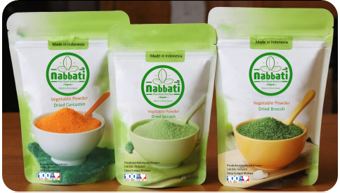 Produk akhir kami adalah nabatti yaitu tepung yang dihasilkan dari sayuran berkualitas tinggi. Tepung yang dapat disimpan jangka panjang dan digunakan untuk bahan baku memasak. Di proses dengan ultra high wave dan uv sterilization untuk memenuhi kebutuhan nutrisi bagi lansia dan tumbuh kembang anak. (Karbohidrat dan mineral alami)